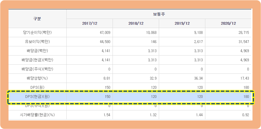 2017년 : 150원 / 2018년 : 120원 / 2019년 : 120원 / 2020년 :180원의 배당금을 지급해오고 있습니다.
