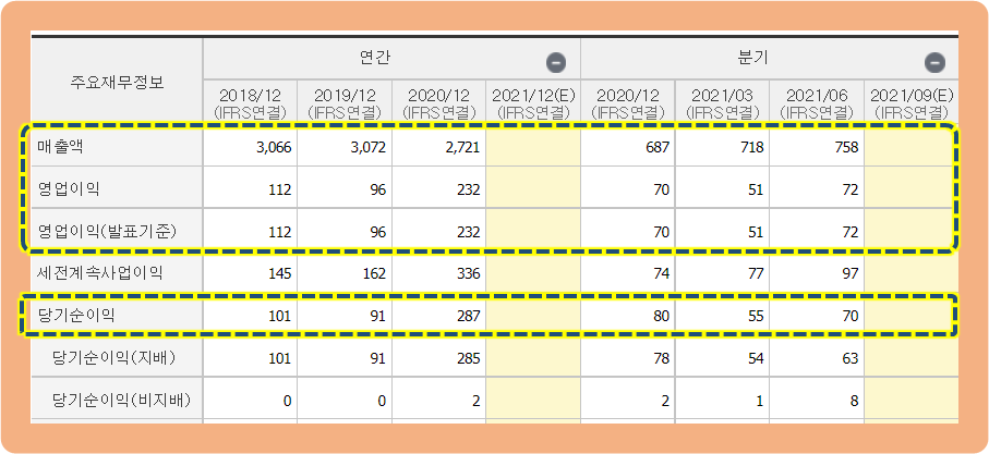 그리고 연간 당기순이익은 2020년도에 약 287억원을 기록하면서, 전년도에 기록한 91억원 대비 무려 3배 이상 증가했네요.