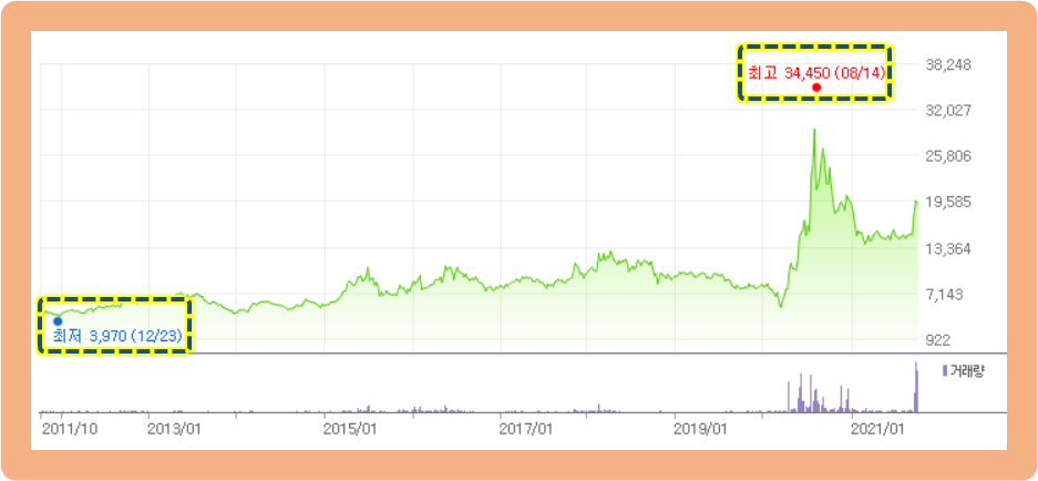 최저점은 2011년 12월에 기록한 3,970원이며, 최고점은 2020년 8월에 기록한 34,450원입니다.