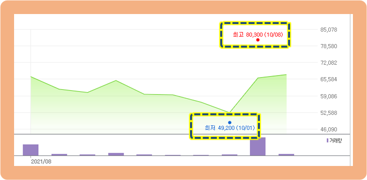 최저점은 2021년 10월 1일에 기록한 49,200원이고, 최고점은 2021년 10월 8일에 기록한 80,300원입니다.