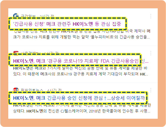 그리고 최근 국내 정부도 머크가 개발한 경구용 코로나 치료제에 관한 선구매를 협의 중이라고 발표했는데, HK이노엔은 머크 관련주 수혜를 톡톡히 보고 있는 상황이네요.