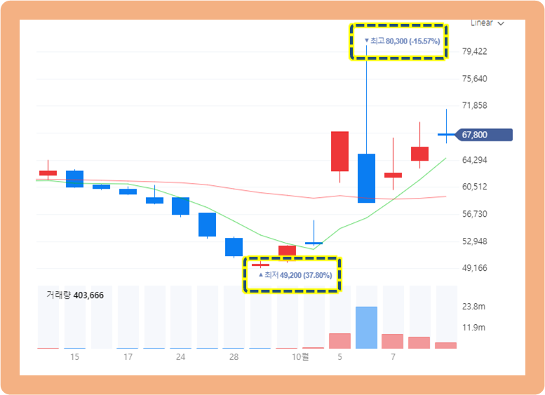 그 이후 반등을 보이며 상승 전환에 성공했고, 2021년 10월 6일에는 최고 80,300원까지 터치했습니다.