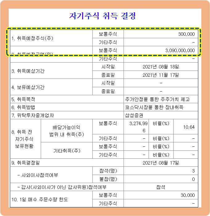 총 30억원 규모이며, 취득기간은 2021년 8 18일~11월17일까지입니다.