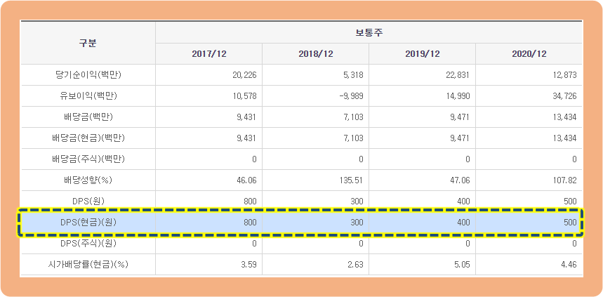 2017년 : 800원 / 2018년 : 300원 / 2019년 : 400원 / 2020년 : 500원의 배당을 실시하고 있습니다.