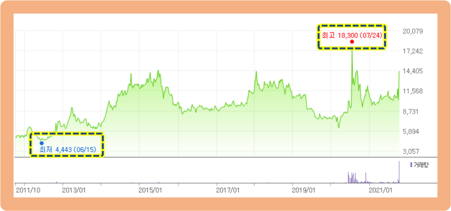 최저가는 2012년 6월에 기록한 4,44원이며, 최고가는 2020년 7월에 기록한 18,300원입니다.