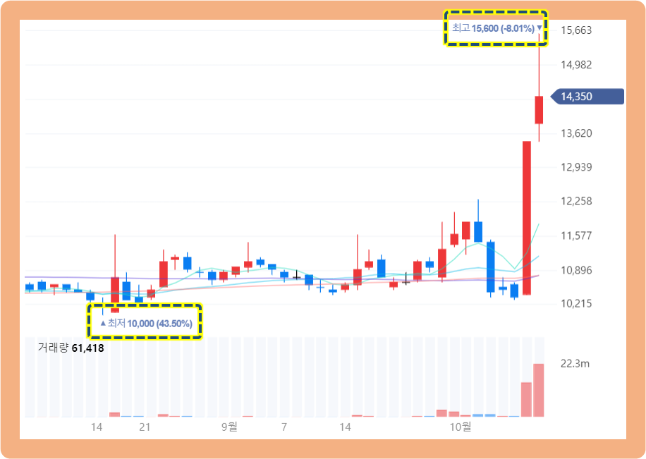 그리고 다음 날인 10월 3일에도 상승세를 이어가면서 최고 15,600원까지 터치했는데요.