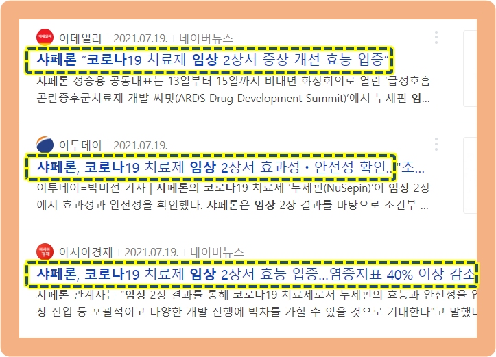 그리고 2021년 7월, 샤페론이 패혈증약인 누세핀을 코로나 치료제로 개발 진행하기 위한 유럽 임상 2상 시험에서 안전성 및 효과성을 확인했다고 발표했죠.
