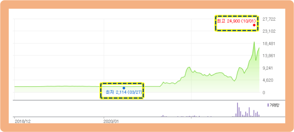 그 이후 상승세가 지속되면서 2021년 9월 30일에는 최고 24,900원까지도 터치했습니다.