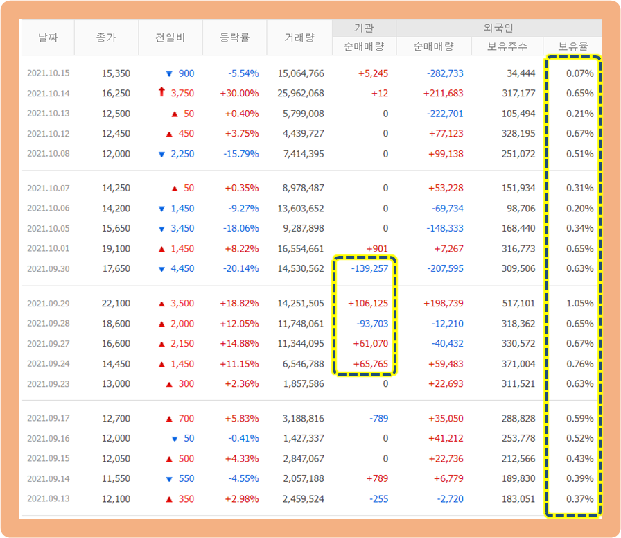 지난 2021년 9월 24일~30일 기관투자자의 거래량이 급증했었는데요.