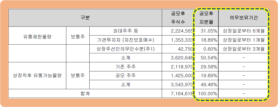 이 중 최대주주 등이 보유하고 있는 약 31%에 해당하는 222만 주는 상장 후 6개월 동안 유통 제한.