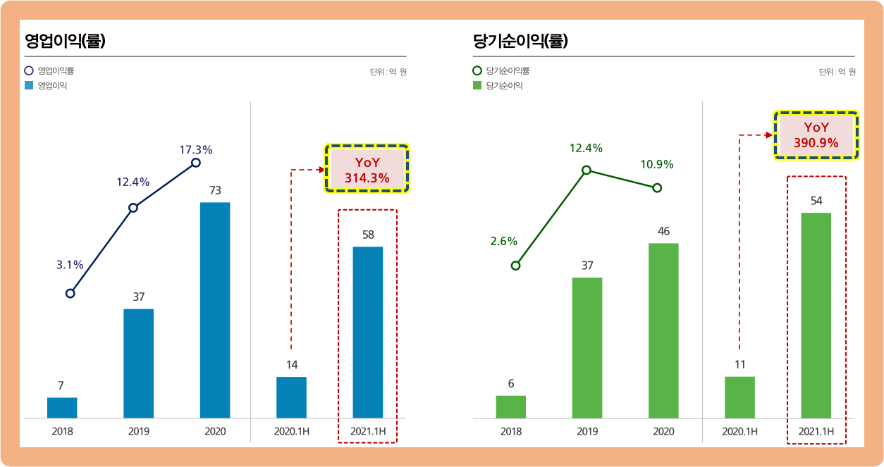 그리고 2021년 상반기의 영업이익은 전년도 상반기 영업이익 대비 약 314.3% 상승했구요.
