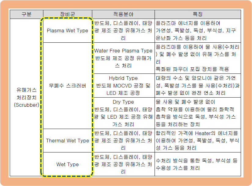 이 기업인 위와같이 Plasma Wet Type, 무폐수 스크러버, Thermal Wet Type, Wet Type 4개의 타입의 장비를 보유하고 있습니다.