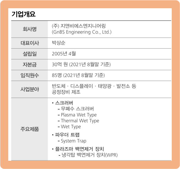 그리고 지앤비에스엔지니어링의 주요 제품으로는 스크러버, 파우더 트랩, 플라즈마 백연제거 장치가 있습니다