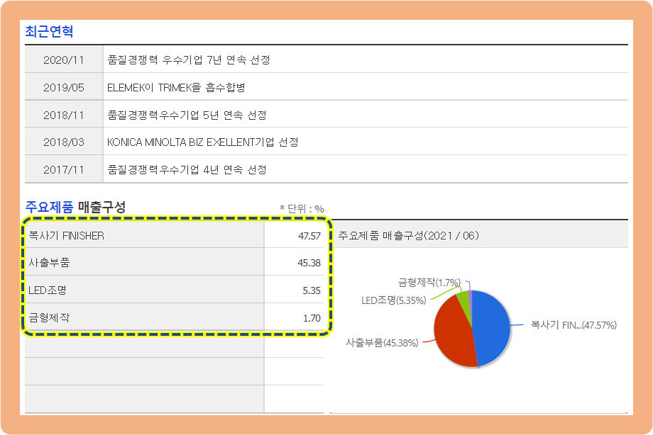 최근연혁과 제품 매출 비중 구성을 살펴보도록 하겠습니다.