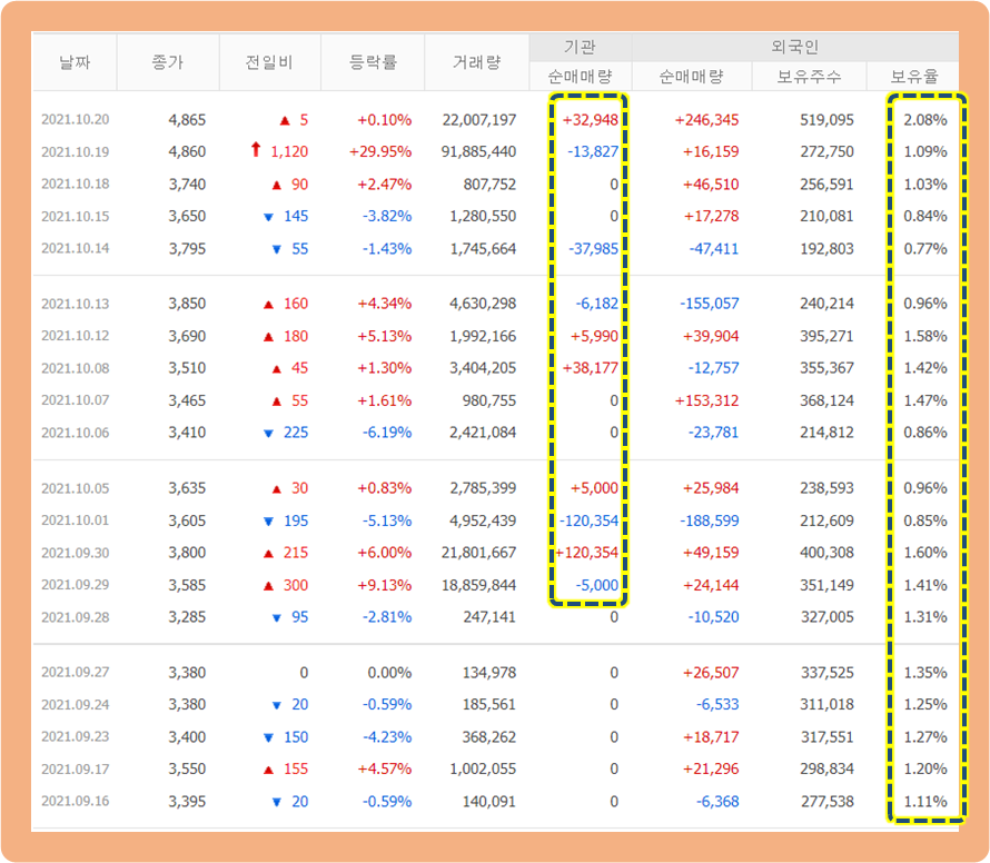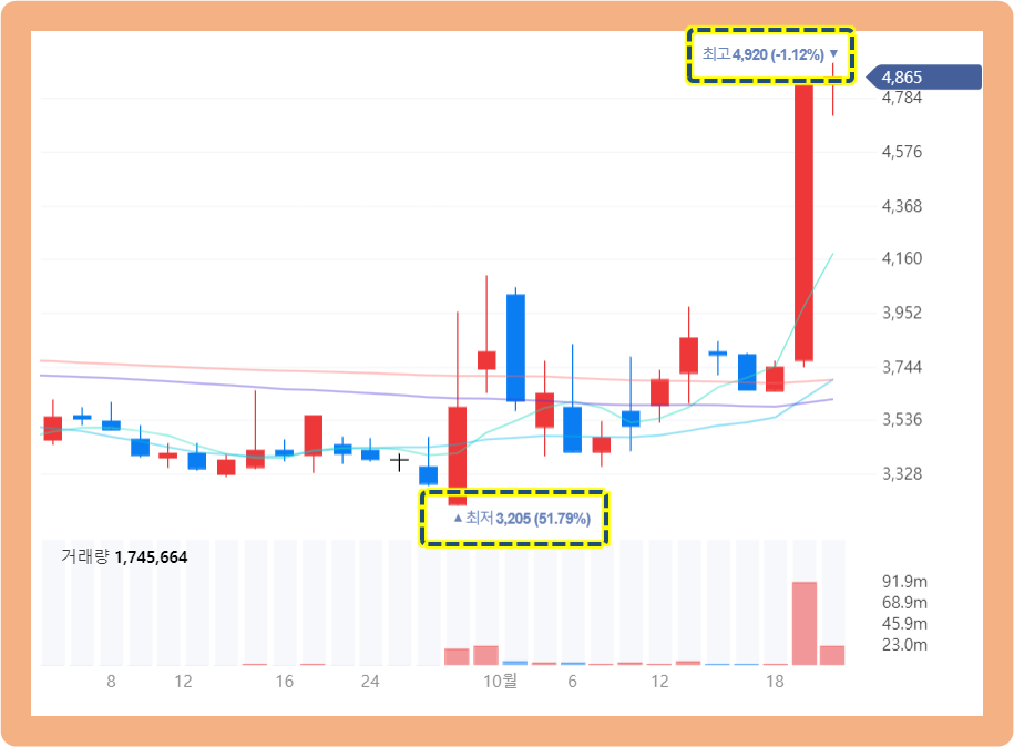 그리고 그 다음 거래일인 10월 20일에도 상승을 이어나가면서 최고 4,920원까지 터치했네요.