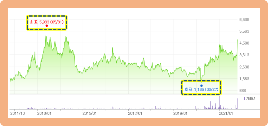 최고가는 2013년 5월에 기록한 5,933원이며, 최저가는 2020년 3월에 기록한 1,165원입니다.