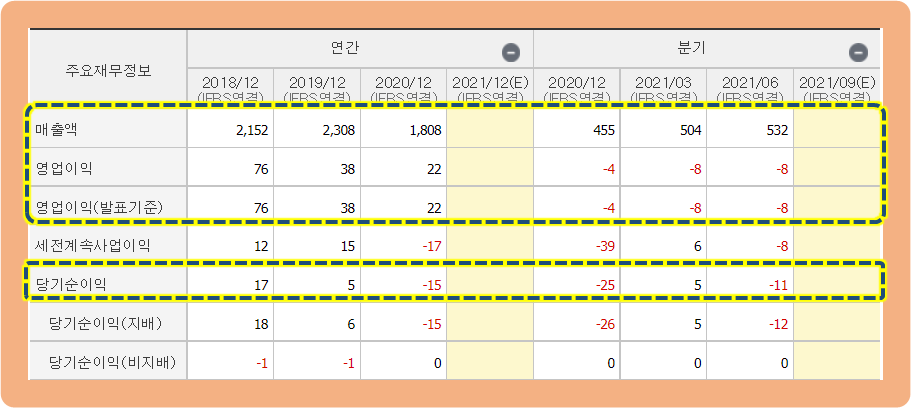 연간 당기순이익도 지난 3년 동안 감소세가 지속되고 있으며, 2020년에는 -15억원 손실을 기록하면서 적자로 전환 된 상황이네요.