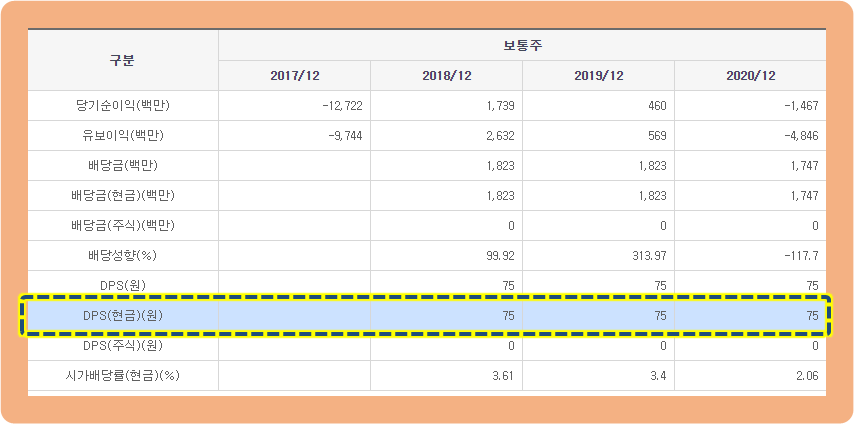 그 이후 2018~2020년, 연속 3개년 동안에는 1주당 75원의 배당금을 꾸준히 지급해주고 있는 모습입니다.