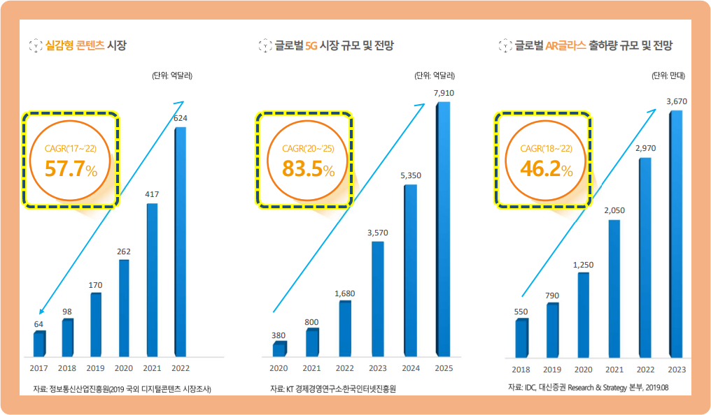 왼쪽 그래프부터 차례대로 실감형 콘텐츠, 글로벌 5G, 글로벌 AR글라스 출하량 규모 등에 관한 내용인데요.