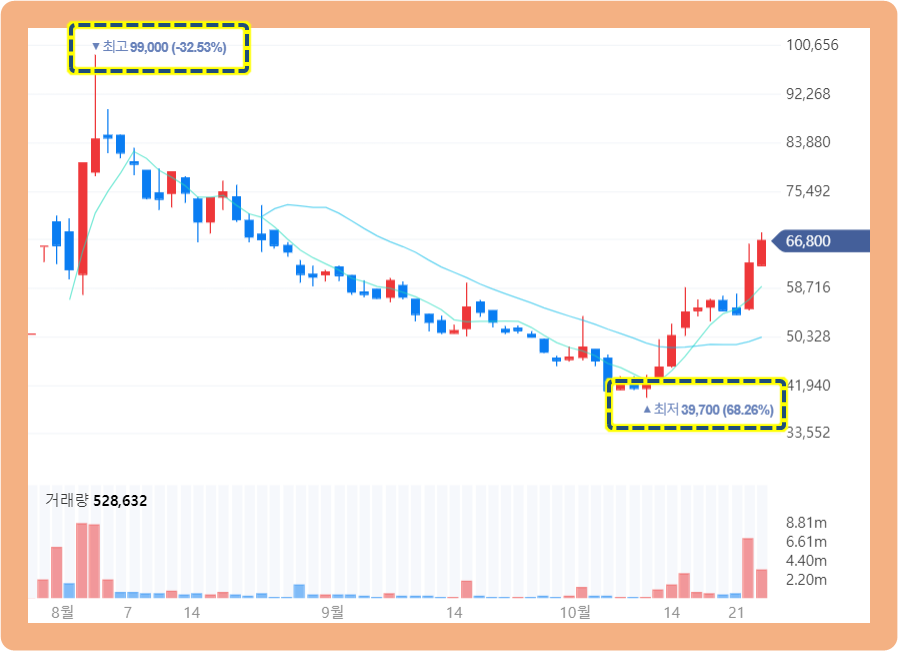 지난 2021년 8월 4일, 주가는 최고 99,000원을 기록하며 상장 이후 최고가를 갱신했었는데요.
