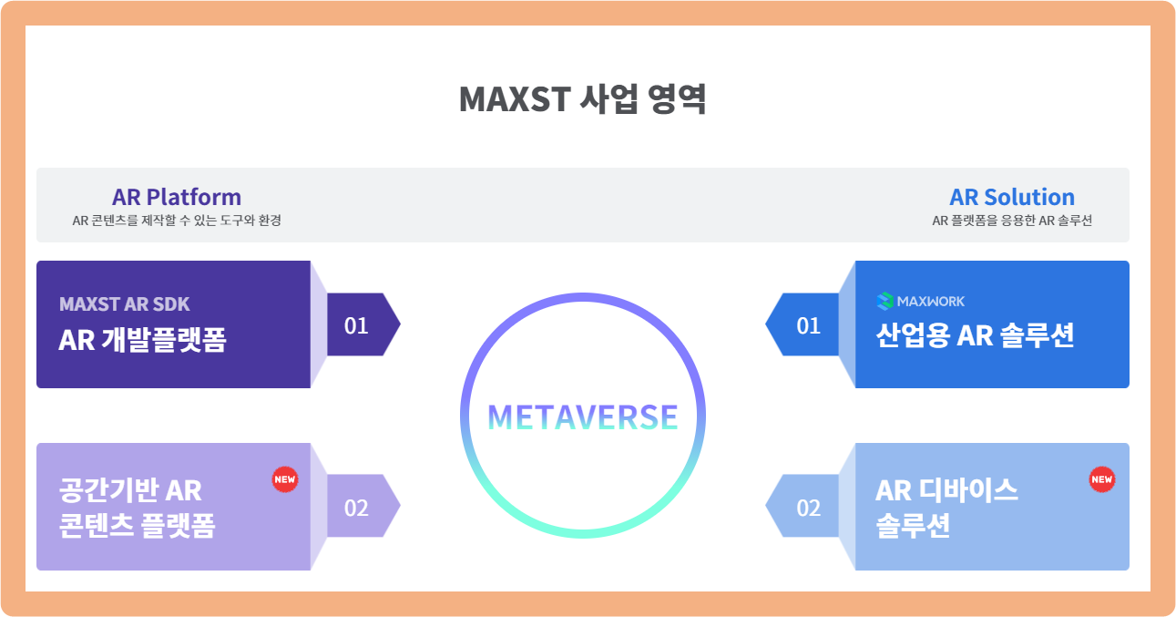 AR솔루션은 산업용 AR 솔루션인 맥스워크와 AR 디바이스 솔루션으로 구성되어 있습니다.