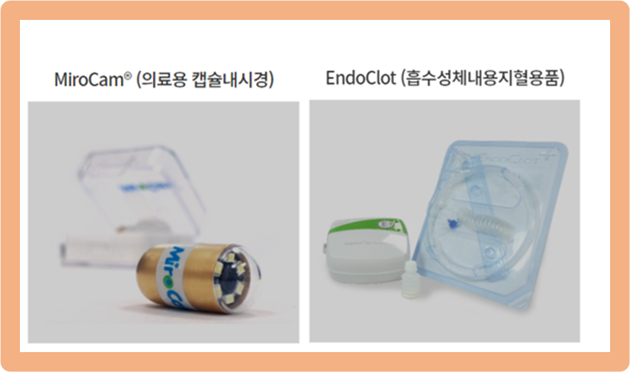 인트로메딕의 주요 의약제품으로는 의료용 캡슐내시경과 흡수성체내용지혈용품이 있는데요.