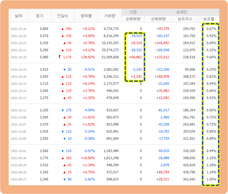 지난 2021년 10월부터 기관투자자의 거래량이 활발해지기 시작했으며, 매도세가 급증한 모습입니다.