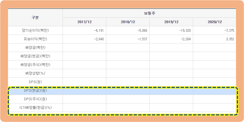위의 재정 상태를 보면 아시겠지만, 현재 이 기업은 주주분들에게 배당을 실시하지 않고 있습니다.