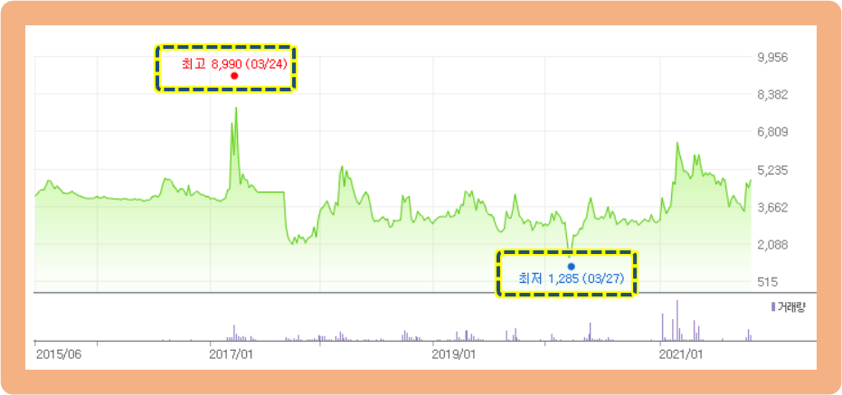 최고가는 2017년 3월에 기록한 8,990원이며, 최저가는 2020년 3월에 기록한 1,285원입니다.