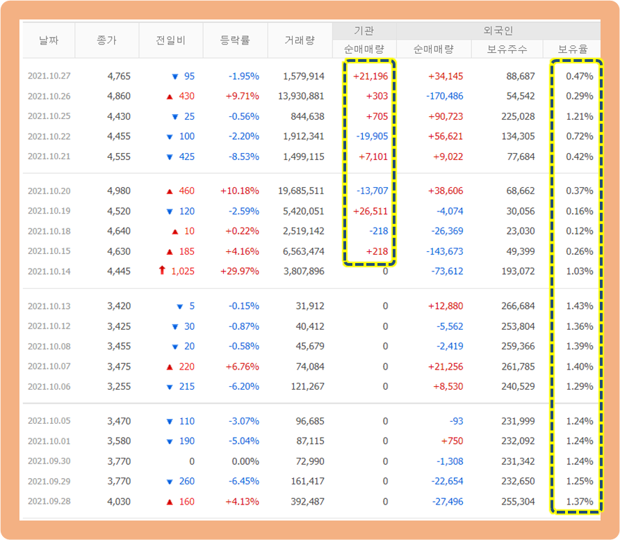 기관투자자의 경우를 보시면, 최근 2021년 10월 5일부터 거래량이 증가하기 시작했으며 매수세가 우위를 점하고 있습니다.