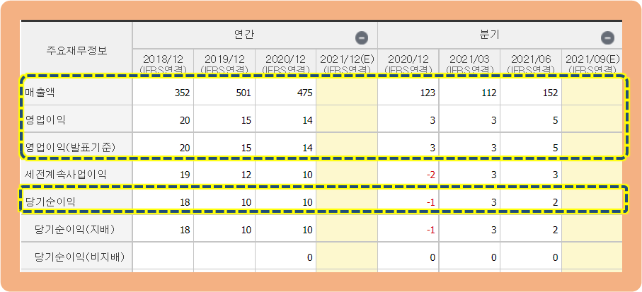2020년 기준으로 영업이익과 당기순이익 각 14억원(2018년 대비 30% 하락), 10억원(2018년 대비 45% 하락)을 기록한 상황이네요.