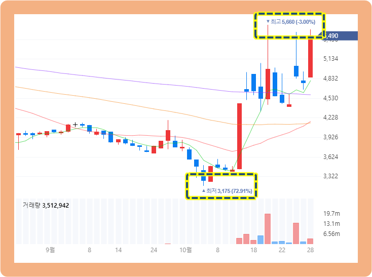 2021년 10월 14일부터 갑자기 장대양봉이 나타나며 급등하기 시작하더니, 2021년 10월 20일에는 최고 5,660원까지 터치했네요.