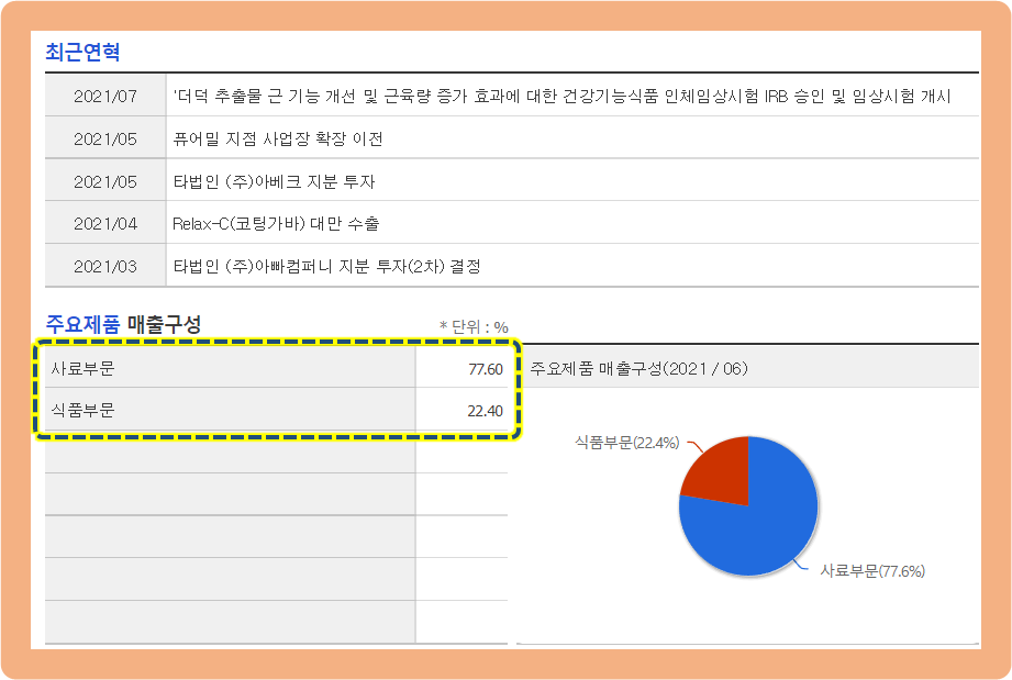 그리고 이 기업의 주요 제품 비중을 비교해보면, 사료 부문이 약 77.6%를 차지하고 있으며 식품 부문이 약 22.4%를 차지하고 있는데요.