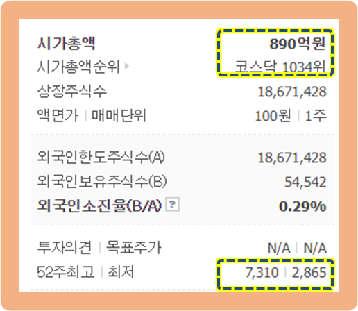 52주 최고가는 7,310원이며, 52주 최저가는 2,865원이네요.
