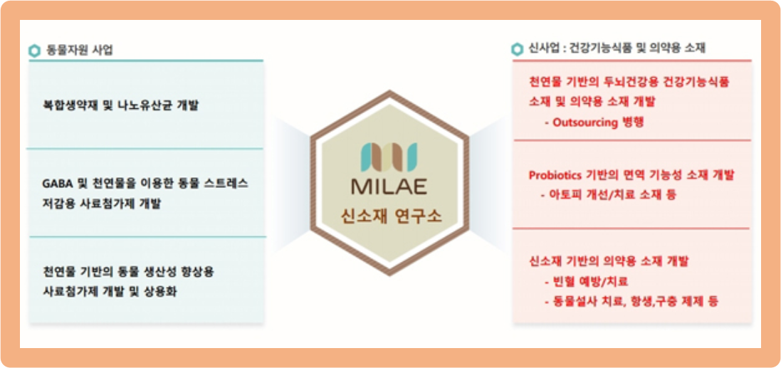 동물지원 사업 : 복합생약재 및 나노유산균 개발, 동물 스트레스 저감용 사료첨가제 개발, 동물 생산성 향상용 사료첨가제 개발 등이 있습니다.
