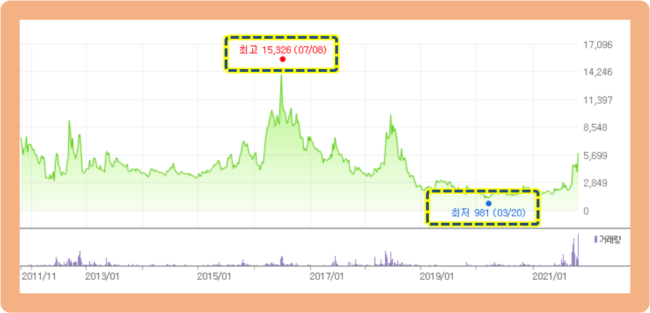 최고가는 2016년 7월에 기록한 15,326원이며, 최저가는 2020년 3월에 기록한 981원입니다.