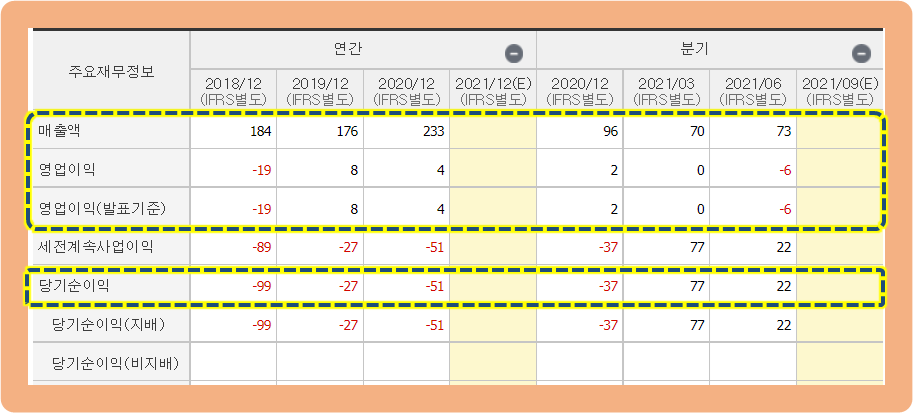 2020년도 기준으로 연간 당기순이익은 -51억원 손실을 기록하면서, 최근 계속해서 적자를 이어나가고 있네요.