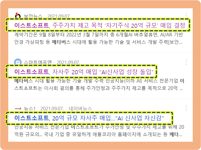 지난 2021녀 9월 7일, 이스트소프트가 주주가치 제고를 목적으로 하는 약 20억 원 규모의 자기주식취득 계약을 진행했다는 공시를 발표했습니다.