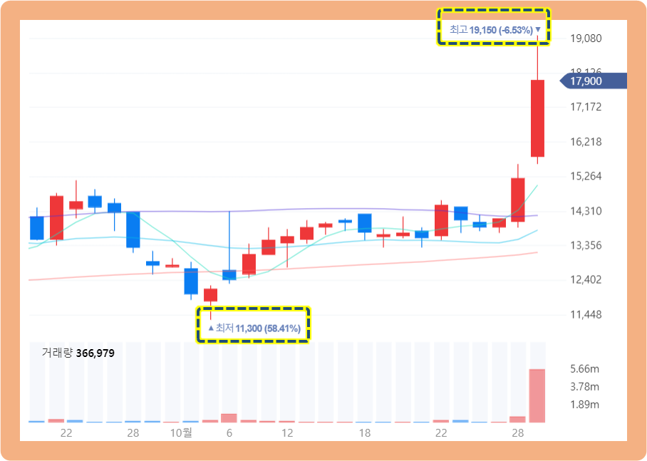 그리고 2021년 10월 28~29일, 이틀간 장대양봉과 함께 주가가 급등하면서 최고 19,150원까지 터치한 상황이네요.