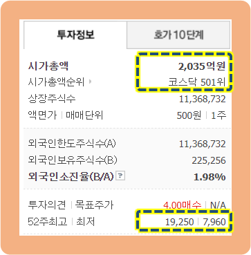 현재 기준으로 시총은 약 2,035억원으로 코스닥 501위인 기업이구요.
