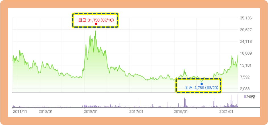 최고가는 2015년 7월에 기록한 31,750원이며, 최저가는 2020년 3월에 기록한 4,780원입니다.