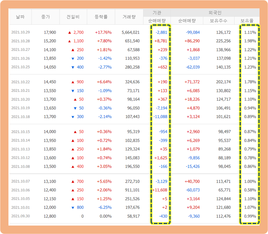 지난 한 달 동안 기관 및 외국인 투자자의 거래 추이를 살펴보도록 하겠습니다.
