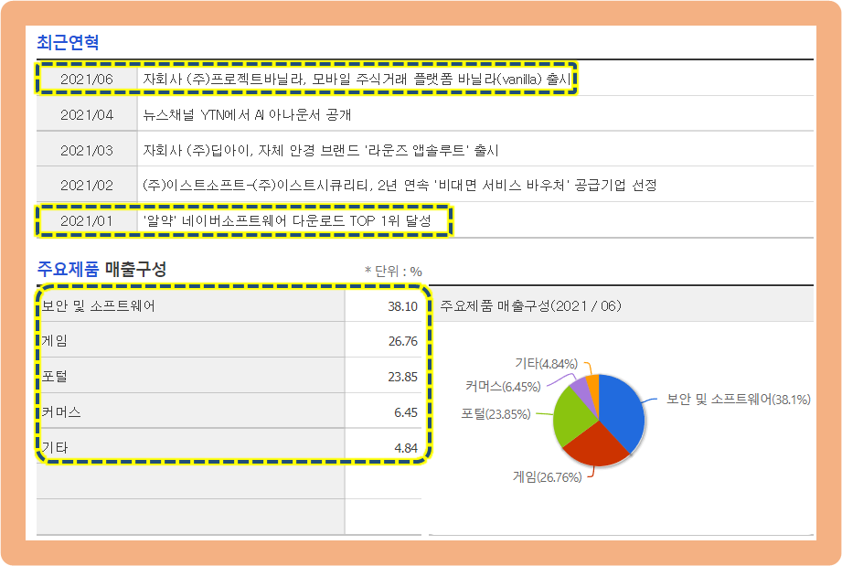 이스트소프트의 최근 연혁과 주요 제품 매출 비중 비교