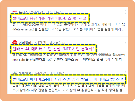 2021년 11월 10일, 셀바스AI가 메타버스 사업을 목적으로 음성기술 기반의 메타버스 랩 부문을 신설했다는 소식이 발표되었습니다.