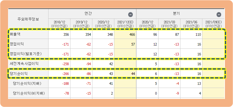 그리고 연간 당기순이익은 2020년도 기준 +43억원 이익을 기록하면서, 흑자 전환에 성공한 모습이네요.