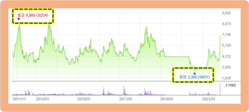 최고가는 2012년 2월에 기록한 8,980원이며, 최저가는 2020년 8월에 기록한 2,305원이네요.