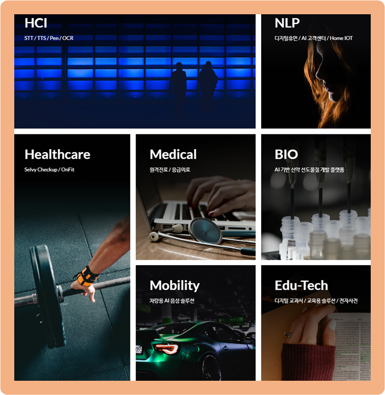 도메인 전문 기술을 기반으로 하는 3. 헬스케어, 4. 메디컬, 5. 모빌리티, 6. 바이오, 7. 에듀테크 랩을 통해 비즈니스에 각종 인공지능 솔루션을 제공하고 있죠.