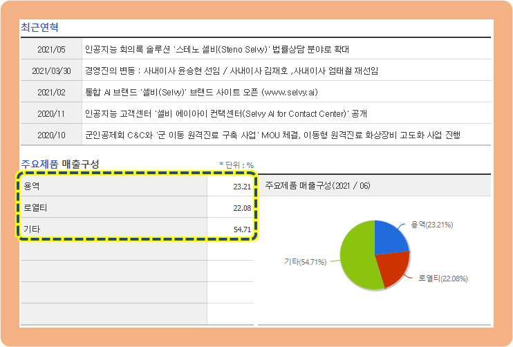 셀바스AI의 최근 연혁과 주요 제품 매출 비중을 살펴보도록 하겠습니다.