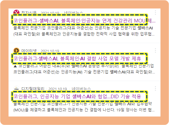 2021년 10월 19일, 셀바스가 블록체인 업체인 코인플러그와 AI와 블록체인을 결합한 사업 협력을 위한 업무협약을 체결했습니다.