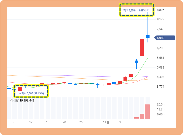 그리고 2021년 11월 10일 주가는 최고 8,670원까지 터치했었지만, 곧바로 수익 차익 실현 매물이 쏟아지면서 최고점 대비 약 19% 하락한 6,980원에 장을 마감했네요.